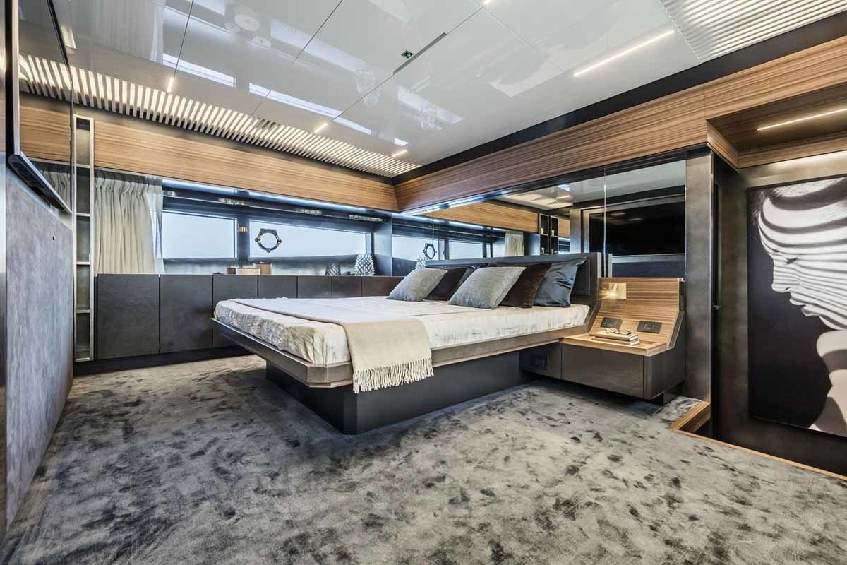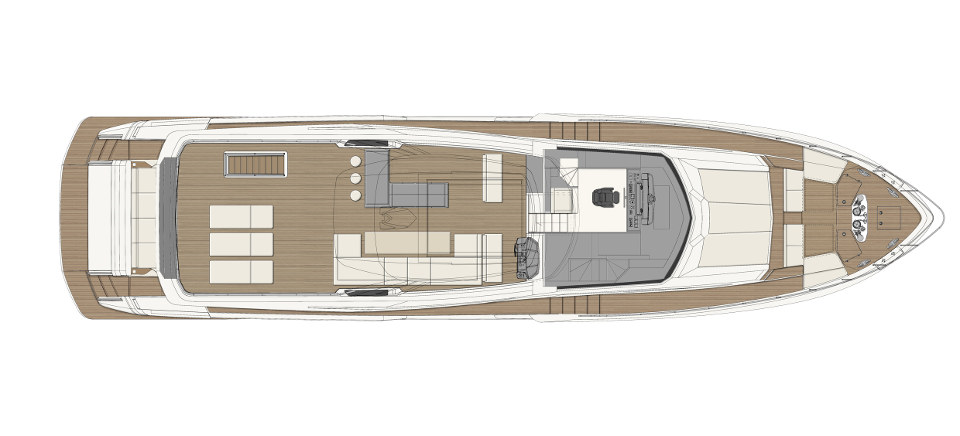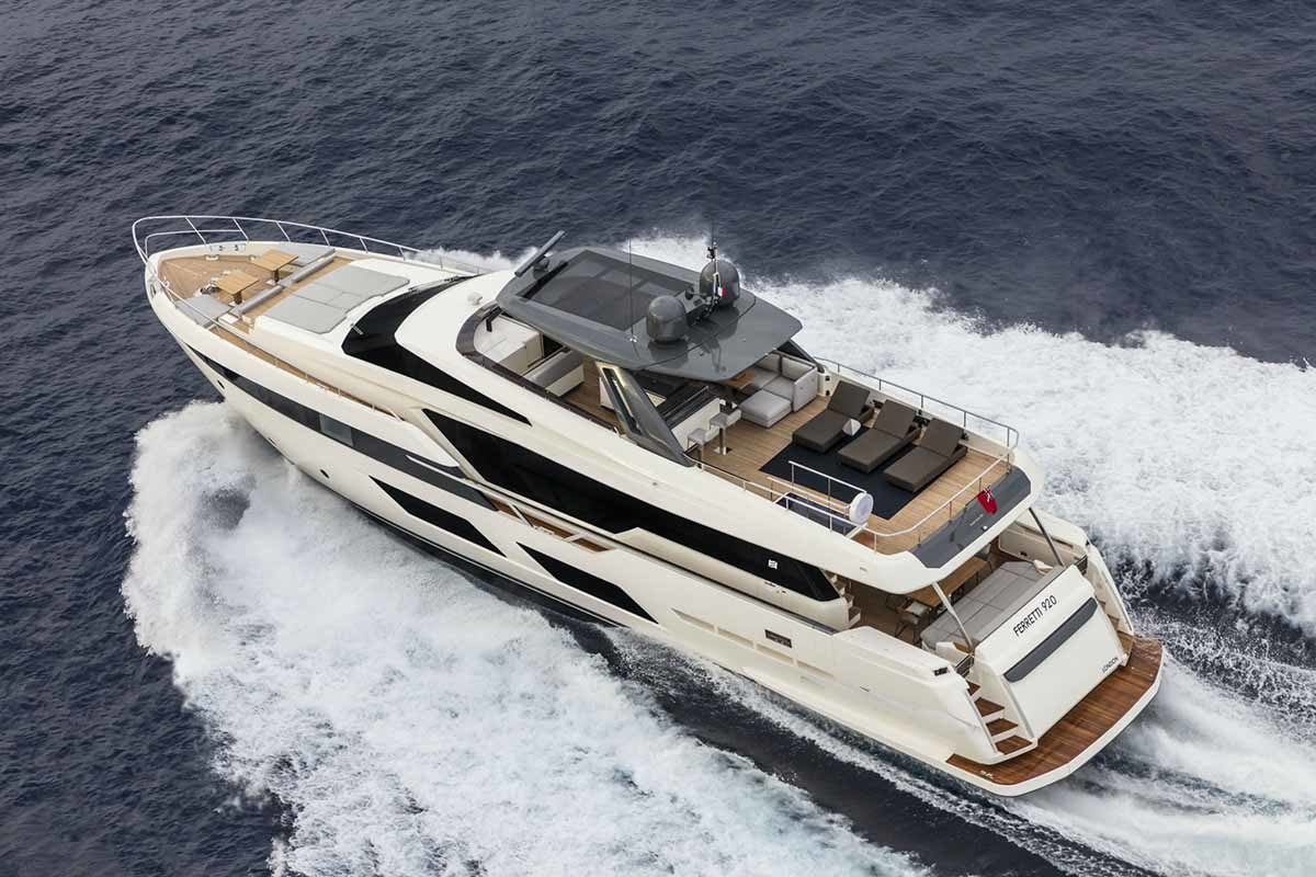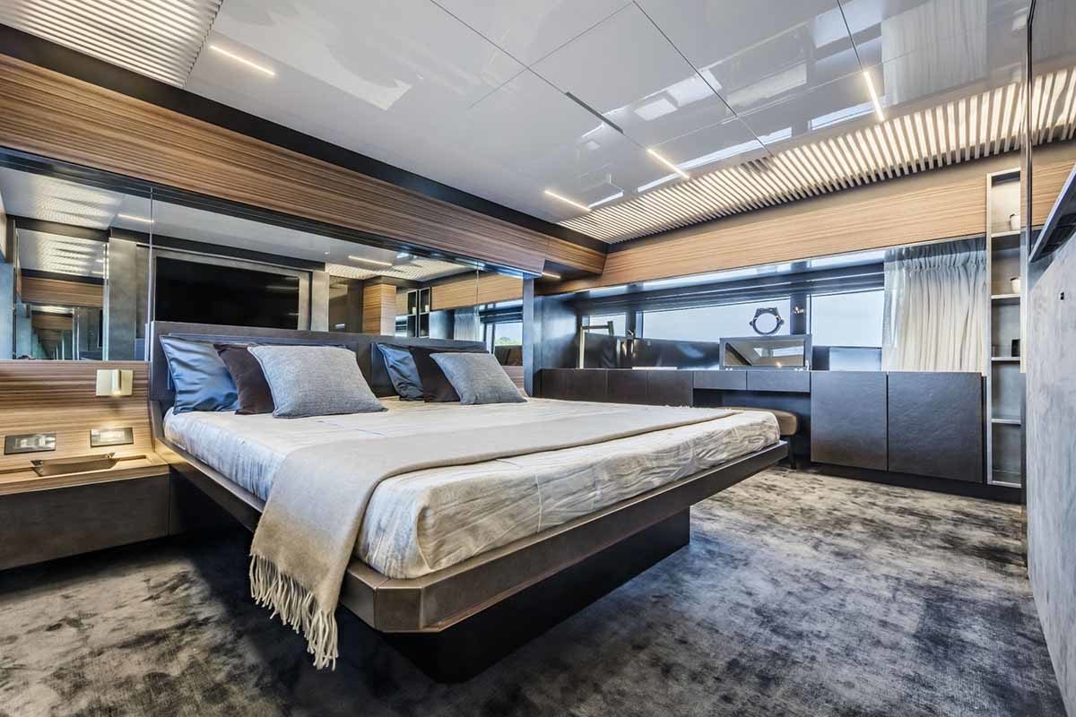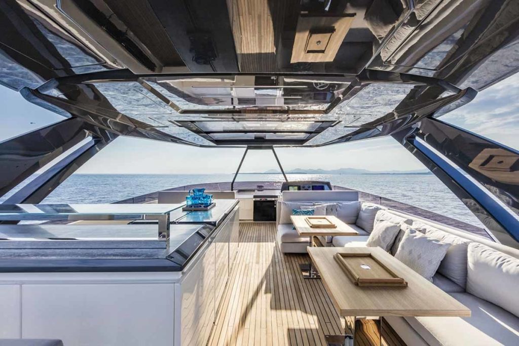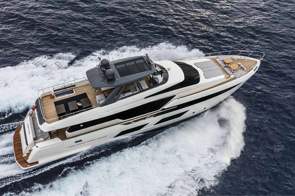 Ferretti Yachts 920, exhibiting all of the serene strength of a giant of the nautical world, is an exceptional yacht not just in terms of its size but also because of its innovative nature. The splendid flybridge, designed by the Ferretti Group’s Product Strategy Committee and Engineering Department in conjunction with Zuccon International Project, stands out due to the ground-breaking introduction of the “wide body” concept. In addition to giving the yacht an imposing presence on the water, the raised forward section of the hull has also allowed a “wide-body” master suite to be included on the main deck. The yacht’s “bold” character is emphasized by the gunwale, which continues beyond the bulwark walkways and “cuts” into the design of the windows in the master cabin. The majestic Ferretti Yachts 920 (28.49 metres LOA) instantly catches the eye. Meanwhile, the hull is 23.98 metres long, so it can be registered as a recreational craft. Its dynamic, irrepressible profile develops the stylistic design features that have led to the international success of recently launched models and have completely modernised the fleet. In addition to the raised forward section, other stunning aspects include the remarkable number of relaxation spaces and the luxurious furnishings in the outdoor areas. The magnificent interiors rival the versions found in higher category models. The pilot house is a technical area with a “futuristic” design. The captain can run the entire yacht from here thanks to a large control station, equipped with a next-gen steering system and a number of touchscreen displays that encompass all of the on-board monitoring systems and navigation instruments.