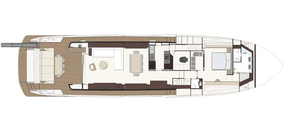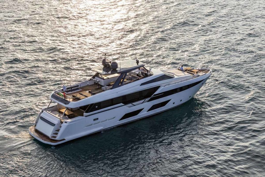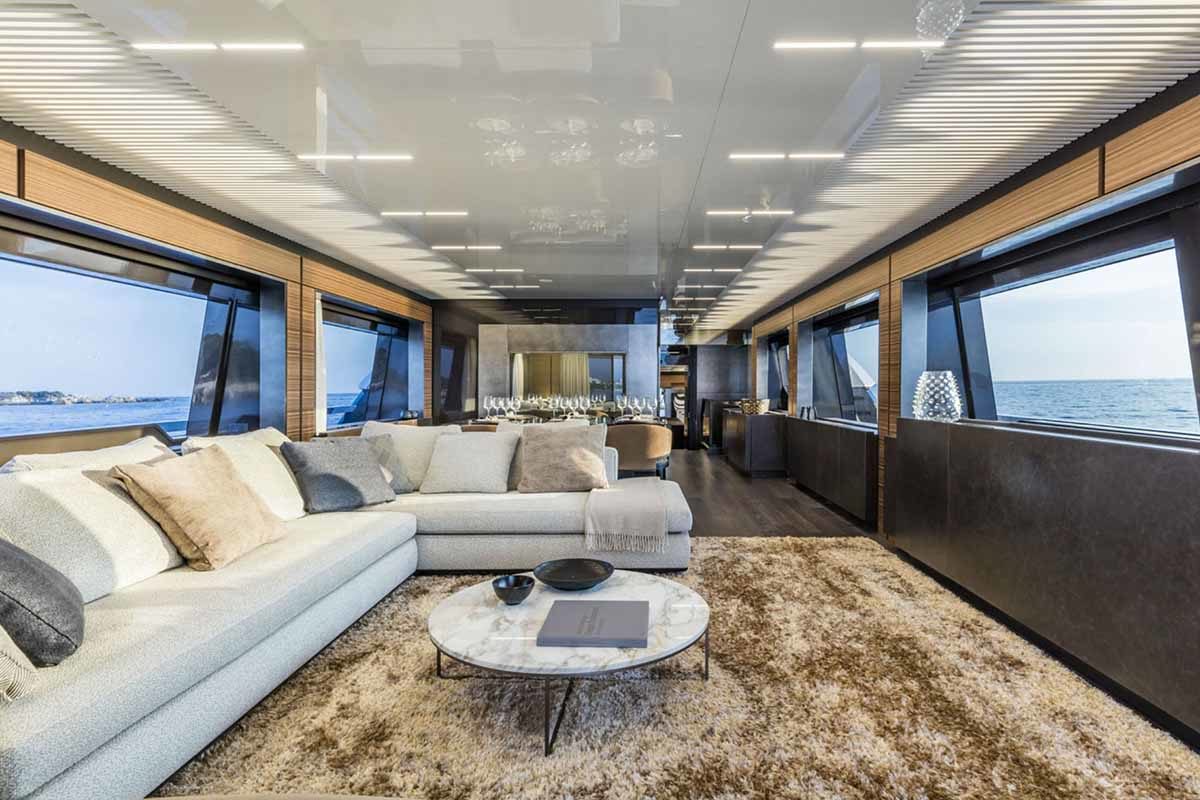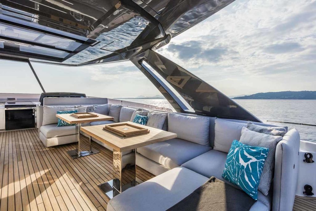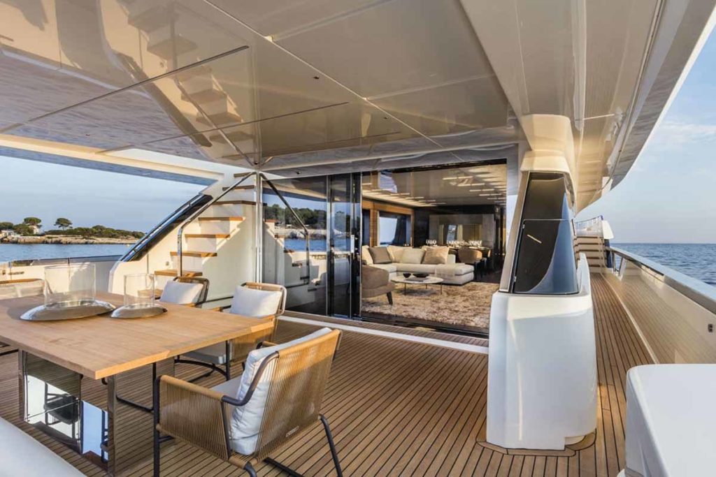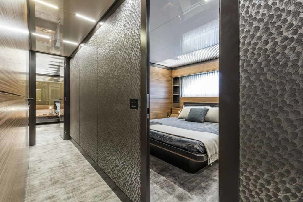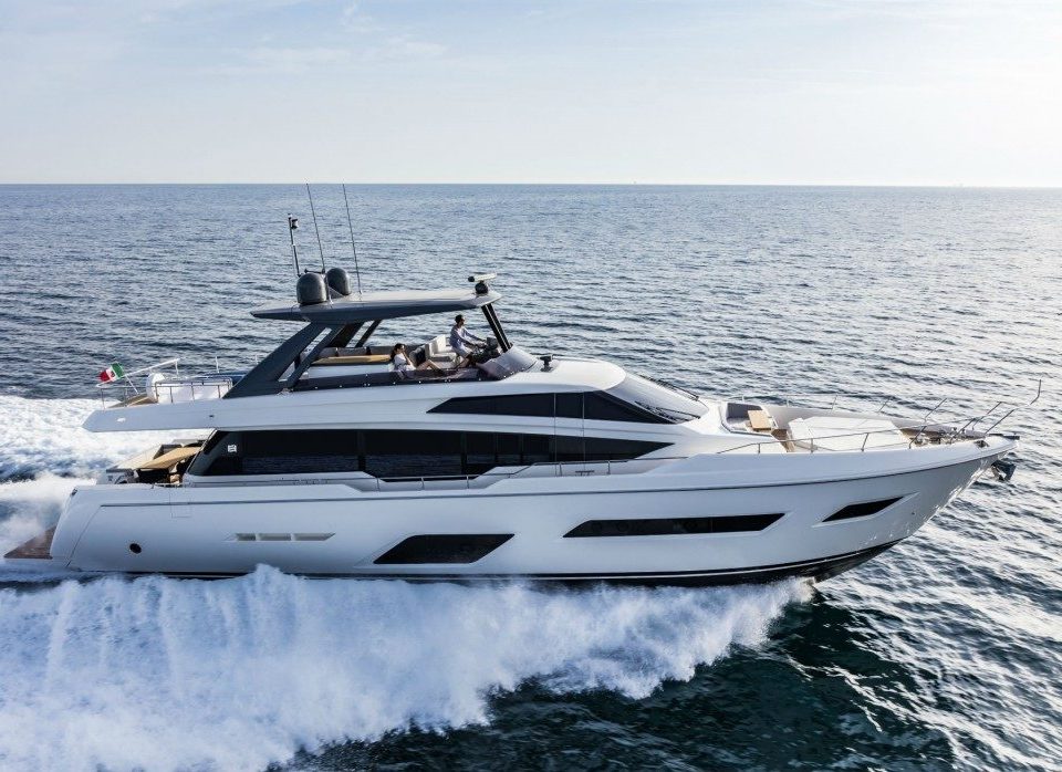 Ferretti Yachts 920, exhibiting all of the serene strength of a giant of the nautical world, is an exceptional yacht not just in terms of its size but also because of its innovative nature. The splendid flybridge, designed by the Ferretti Group’s Product Strategy Committee and Engineering Department in conjunction with Zuccon International Project, stands out due to the ground-breaking introduction of the “wide body” concept. In addition to giving the yacht an imposing presence on the water, the raised forward section of the hull has also allowed a “wide-body” master suite to be included on the main deck. The yacht’s “bold” character is emphasized by the gunwale, which continues beyond the bulwark walkways and “cuts” into the design of the windows in the master cabin. The majestic Ferretti Yachts 920 (28.49 metres LOA) instantly catches the eye. Meanwhile, the hull is 23.98 metres long, so it can be registered as a recreational craft. Its dynamic, irrepressible profile develops the stylistic design features that have led to the international success of recently launched models and have completely modernised the fleet. In addition to the raised forward section, other stunning aspects include the remarkable number of relaxation spaces and the luxurious furnishings in the outdoor areas. The magnificent interiors rival the versions found in higher category models. The pilot house is a technical area with a “futuristic” design. The captain can run the entire yacht from here thanks to a large control station, equipped with a next-gen steering system and a number of touchscreen displays that encompass all of the on-board monitoring systems and navigation instruments.