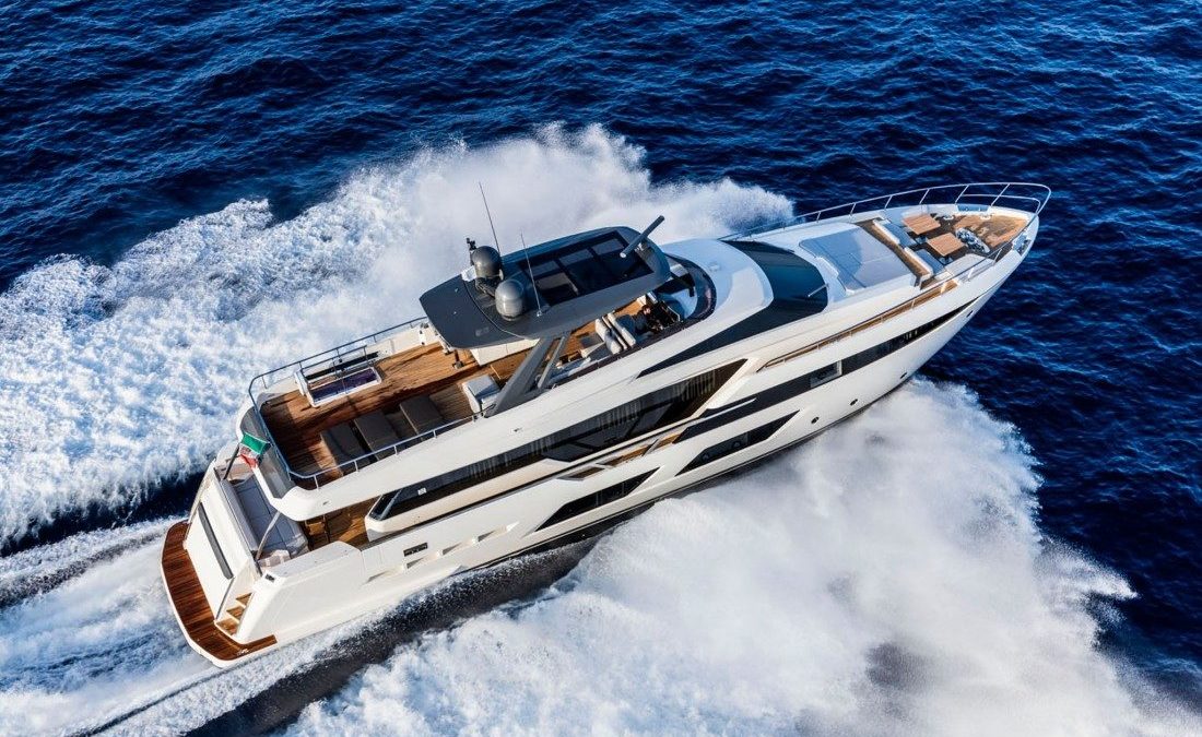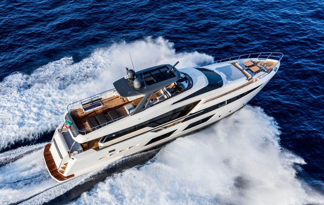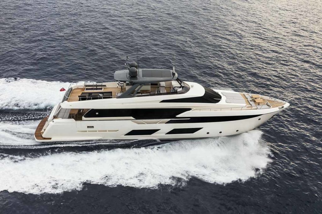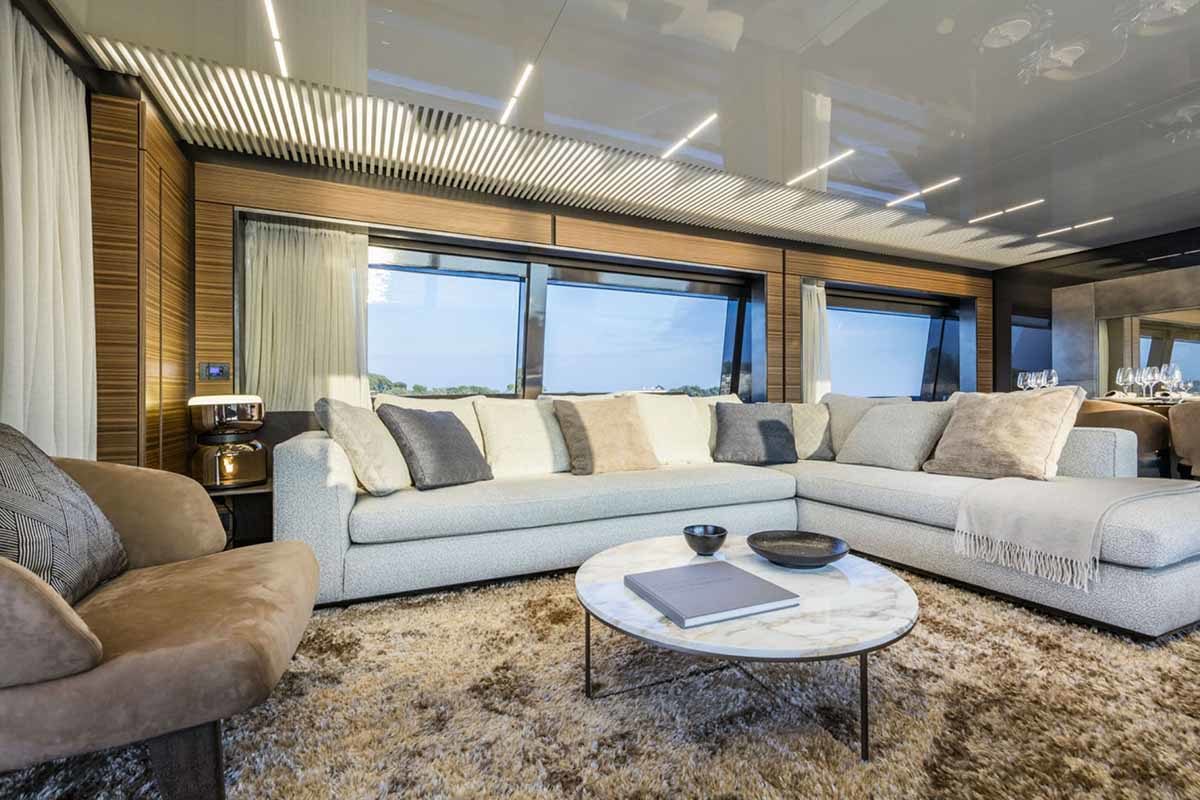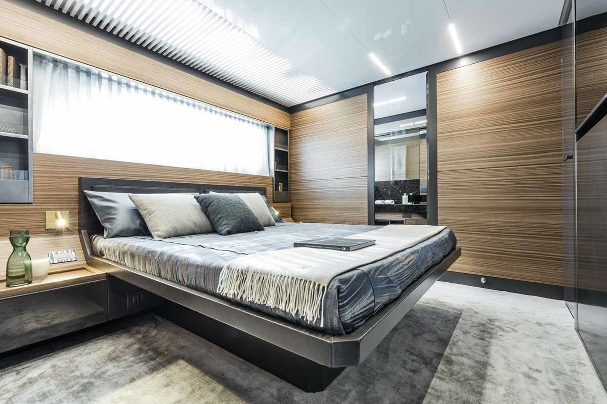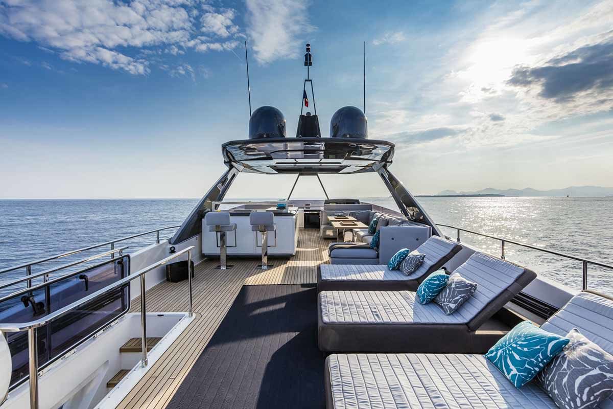 Ferretti Yachts 920, exhibiting all of the serene strength of a giant of the nautical world, is an exceptional yacht not just in terms of its size but also because of its innovative nature. The splendid flybridge, designed by the Ferretti Group’s Product Strategy Committee and Engineering Department in conjunction with Zuccon International Project, stands out due to the ground-breaking introduction of the “wide body” concept. In addition to giving the yacht an imposing presence on the water, the raised forward section of the hull has also allowed a “wide-body” master suite to be included on the main deck. The yacht’s “bold” character is emphasized by the gunwale, which continues beyond the bulwark walkways and “cuts” into the design of the windows in the master cabin. The majestic Ferretti Yachts 920 (28.49 metres LOA) instantly catches the eye. Meanwhile, the hull is 23.98 metres long, so it can be registered as a recreational craft. Its dynamic, irrepressible profile develops the stylistic design features that have led to the international success of recently launched models and have completely modernised the fleet. In addition to the raised forward section, other stunning aspects include the remarkable number of relaxation spaces and the luxurious furnishings in the outdoor areas. The magnificent interiors rival the versions found in higher category models. The pilot house is a technical area with a “futuristic” design. The captain can run the entire yacht from here thanks to a large control station, equipped with a next-gen steering system and a number of touchscreen displays that encompass all of the on-board monitoring systems and navigation instruments.