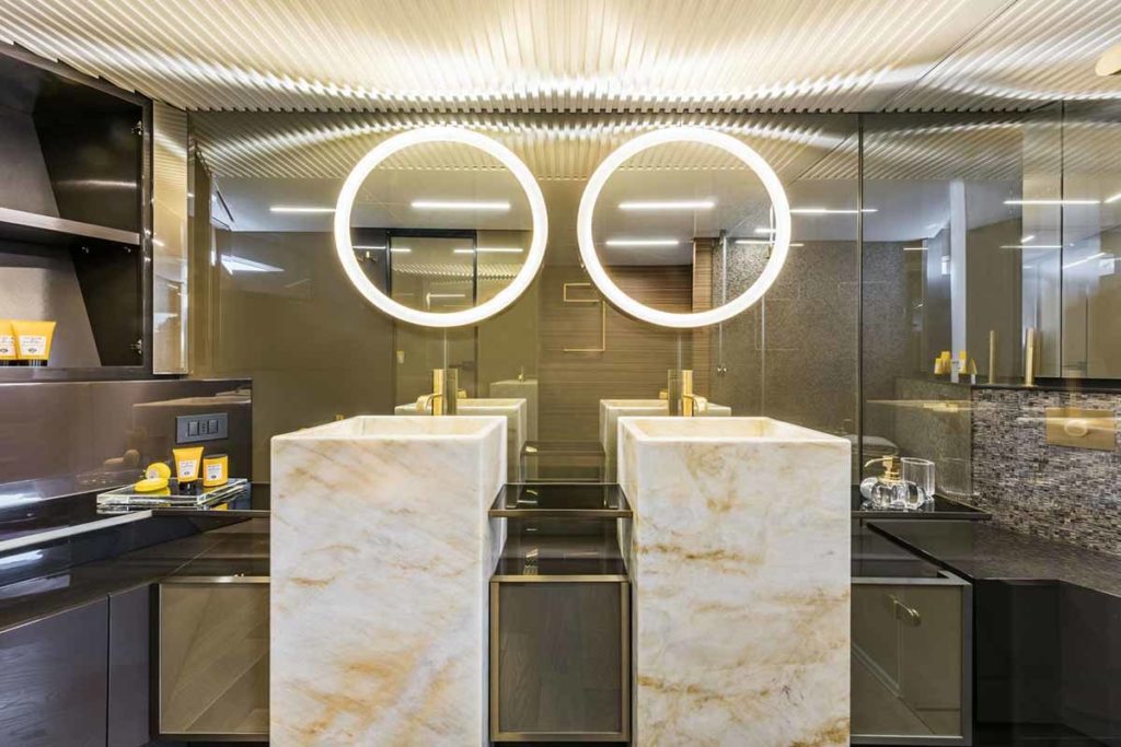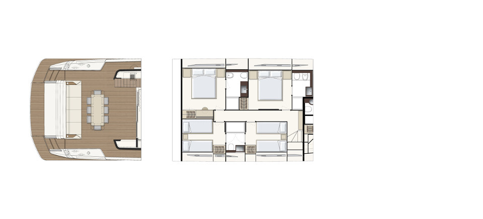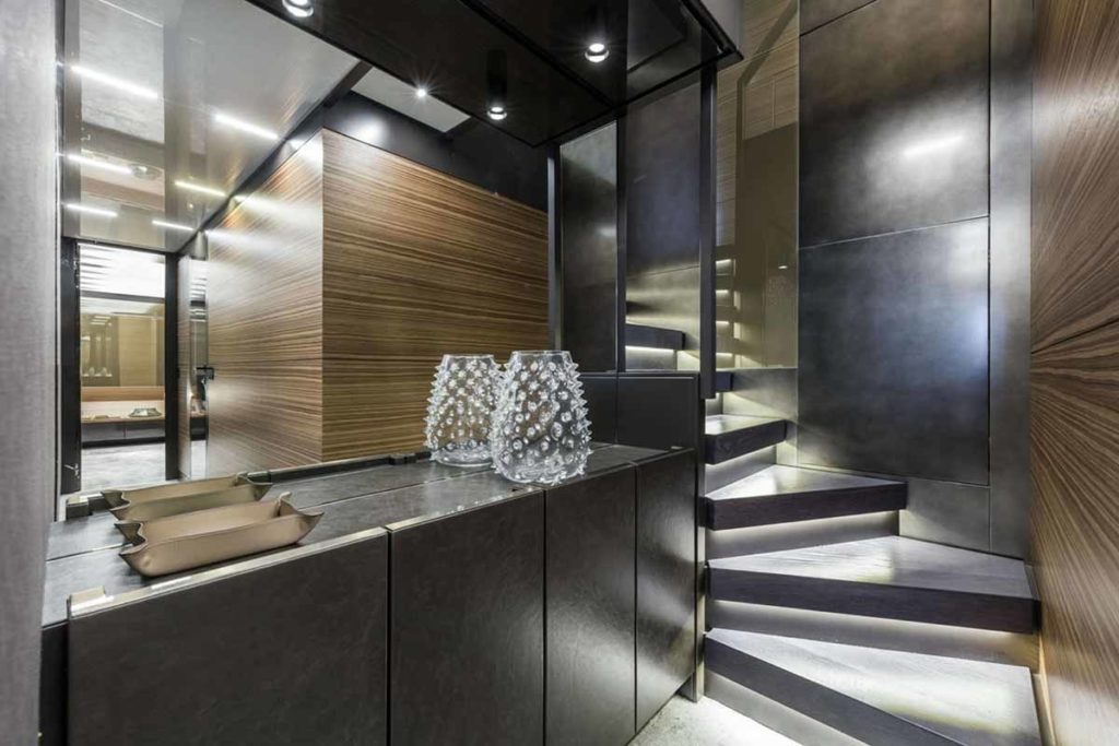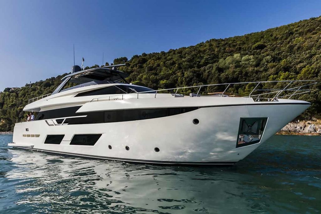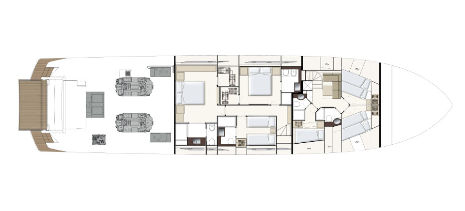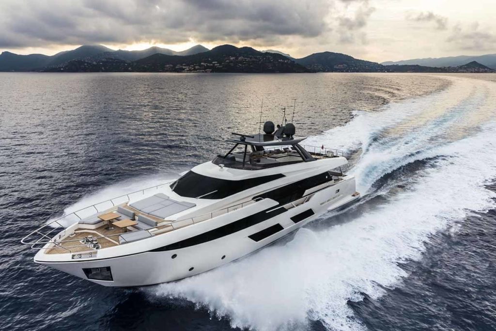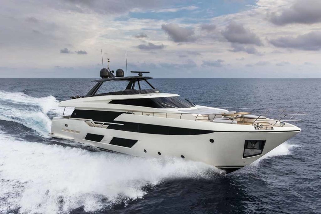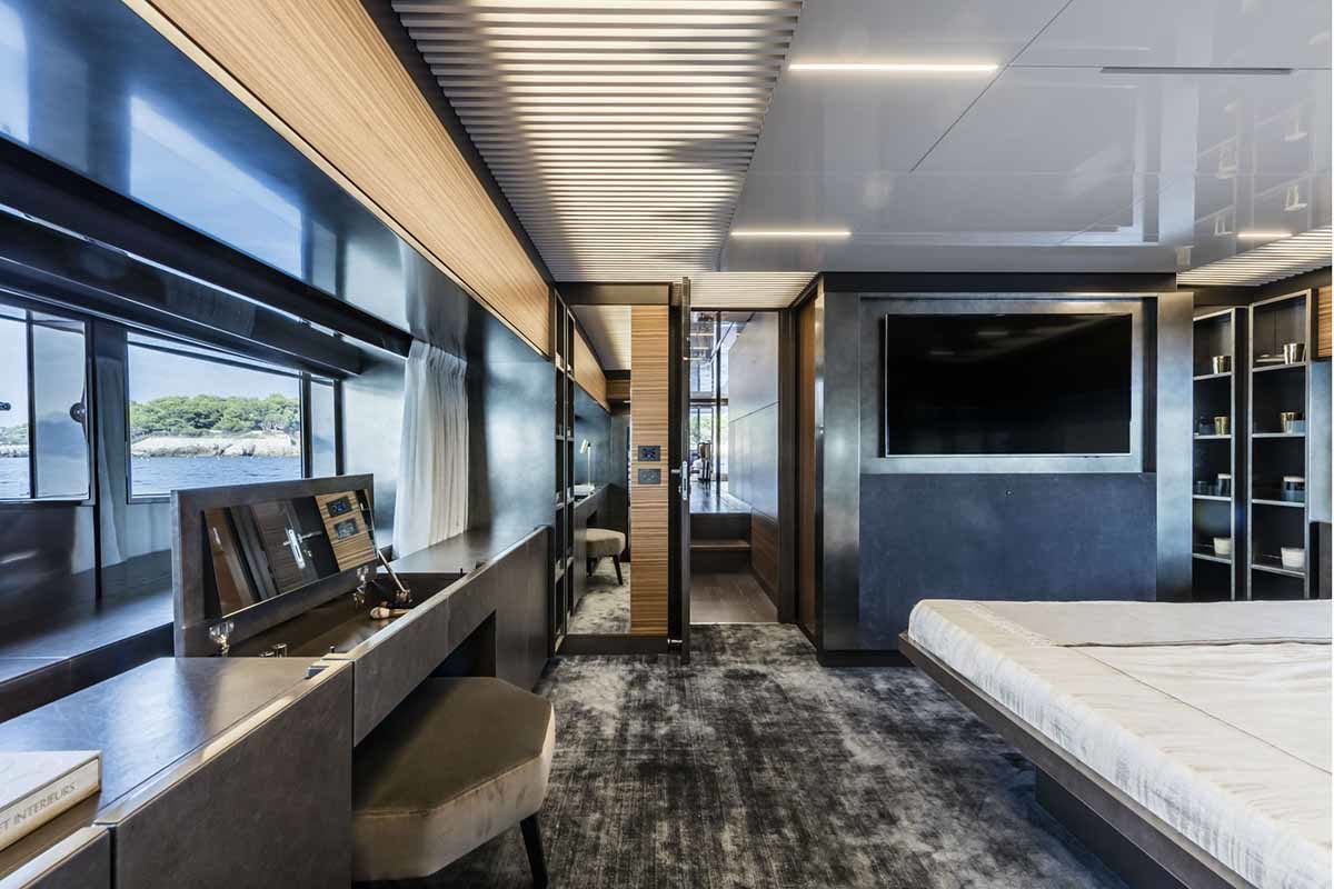 Ferretti Yachts 920, exhibiting all of the serene strength of a giant of the nautical world, is an exceptional yacht not just in terms of its size but also because of its innovative nature. The splendid flybridge, designed by the Ferretti Group’s Product Strategy Committee and Engineering Department in conjunction with Zuccon International Project, stands out due to the ground-breaking introduction of the “wide body” concept. In addition to giving the yacht an imposing presence on the water, the raised forward section of the hull has also allowed a “wide-body” master suite to be included on the main deck. The yacht’s “bold” character is emphasized by the gunwale, which continues beyond the bulwark walkways and “cuts” into the design of the windows in the master cabin. The majestic Ferretti Yachts 920 (28.49 metres LOA) instantly catches the eye. Meanwhile, the hull is 23.98 metres long, so it can be registered as a recreational craft. Its dynamic, irrepressible profile develops the stylistic design features that have led to the international success of recently launched models and have completely modernised the fleet. In addition to the raised forward section, other stunning aspects include the remarkable number of relaxation spaces and the luxurious furnishings in the outdoor areas. The magnificent interiors rival the versions found in higher category models. The pilot house is a technical area with a “futuristic” design. The captain can run the entire yacht from here thanks to a large control station, equipped with a next-gen steering system and a number of touchscreen displays that encompass all of the on-board monitoring systems and navigation instruments.